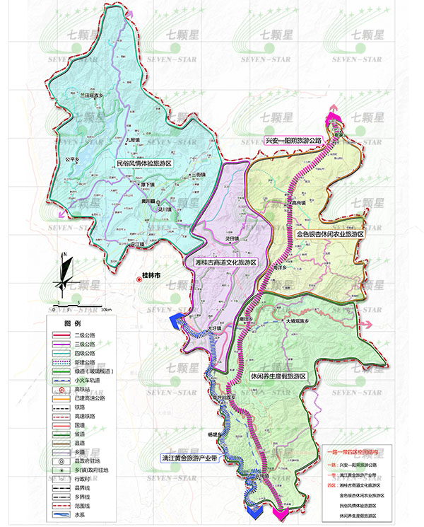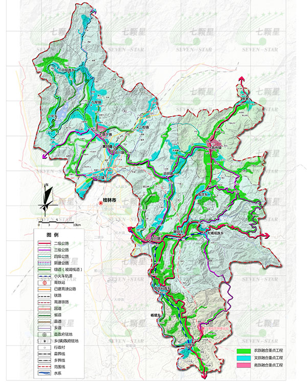 桂林東線全域涉及4縣/區(qū)17鄉(xiāng)/鎮(zhèn),包括靈川縣7鎮(zhèn)5鄉(xiāng),雁山區(qū)草坪回族鄉(xiāng)和陽朔縣興坪鎮(zhèn)、楊堤鄉(xiāng),興安縣高尚鎮(zhèn)、崔家鄉(xiāng),規(guī)劃總面積310740公頃。